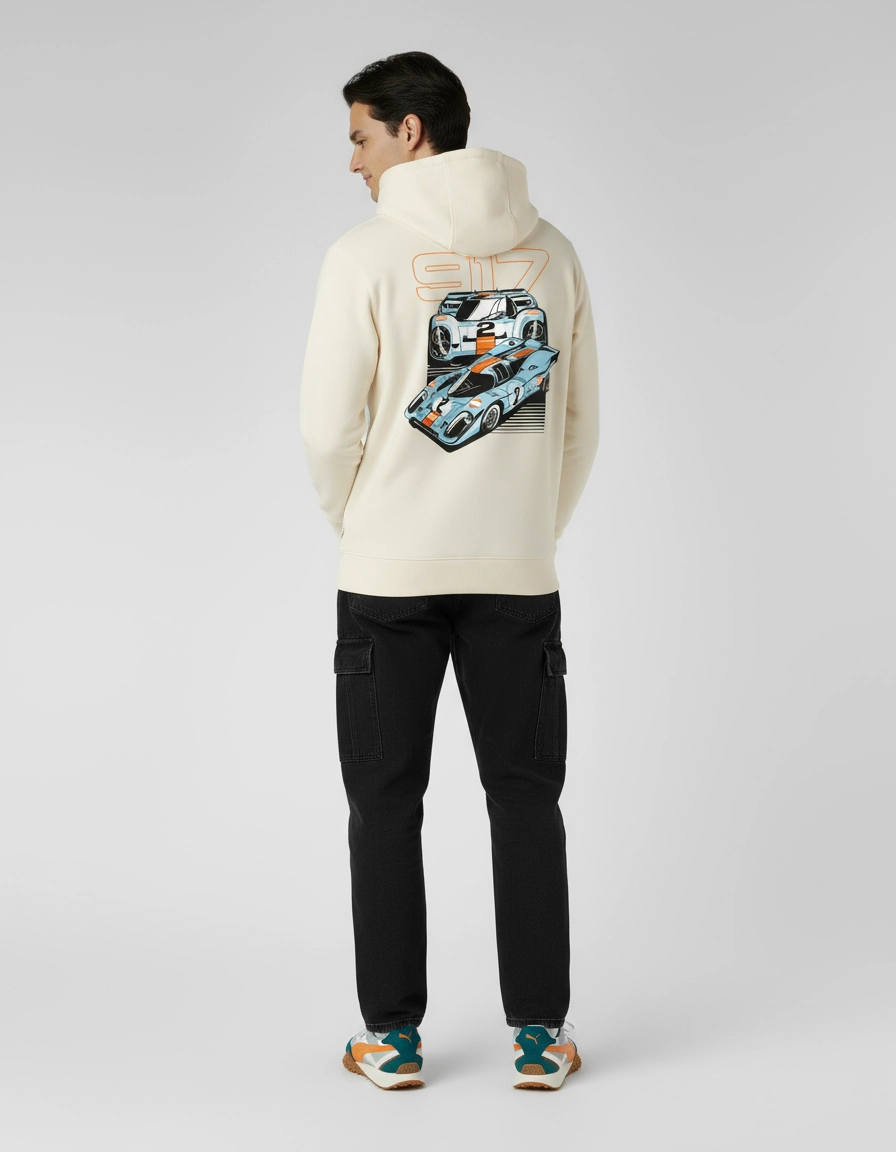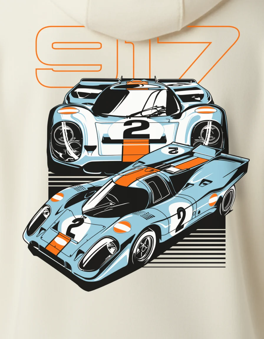 Celebrate racing heritage with the 917 Porsche Off-White Hoodie from Laugh n Slay. Features iconic Porsche 917 race car illustrations with dynamic blue and orange design elements. Premium cotton blend hoodie with adjustable drawstrings and kangaroo pocket. Perfect for Porsche enthusiasts and racing fans who appreciate legendary Le Mans history.