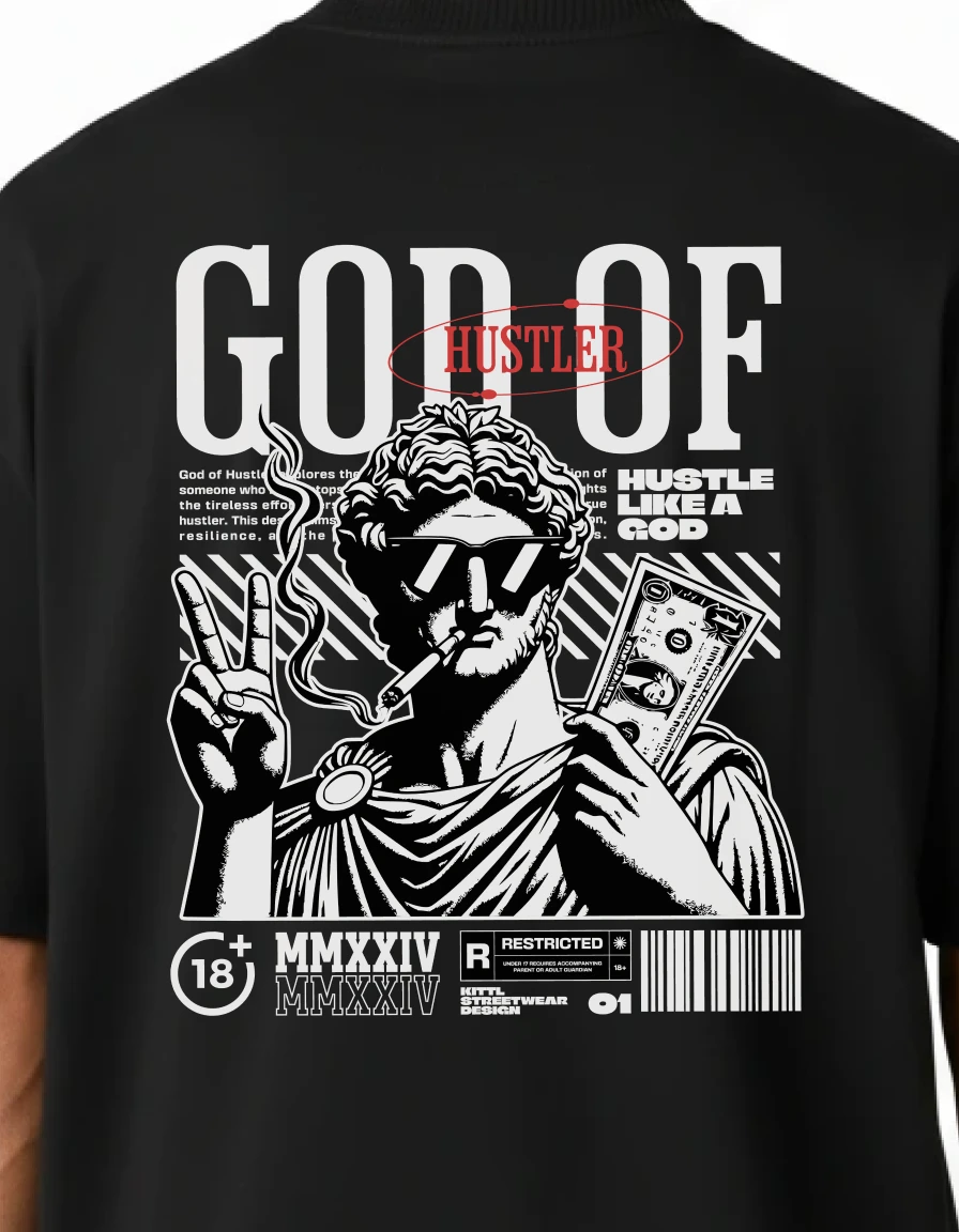 Worship the grind with the God Of Hustler Black Premium Oversized T-Shirt. Features dramatic monochrome illustration with bold "GOD OF HUSTLER" typography and "MODERN DAY GANGSTER" tagline. Premium cotton with higher GSM delivers superior quality. For entrepreneurs, go-getters, and hustlers who treat their ambition like religion.