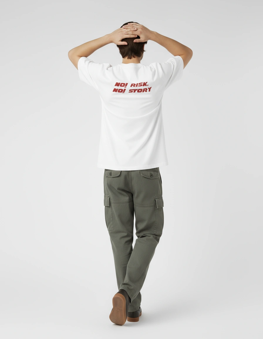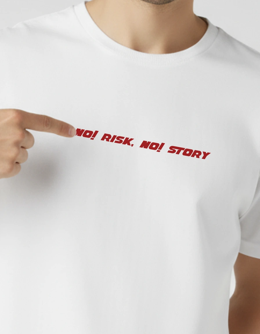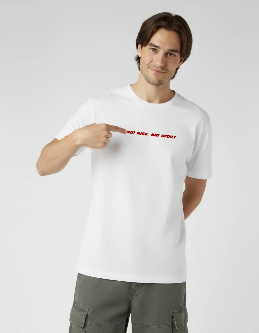 Live boldly with our "No Risk, No Story" White Oversized T-Shirt. This inspirational piece features eye-catching red typography on a crisp white background, embodying the spirit of adventure and courage. Perfect for risk-takers, entrepreneurs, and anyone who believes that life's greatest rewards come from stepping outside comfort zones. The oversized fit ensures comfort as you chase your dreams, while the clean design makes a powerful statement without being overwhelming. Wear your philosophy and inspire others with this motivational wardrobe piece.