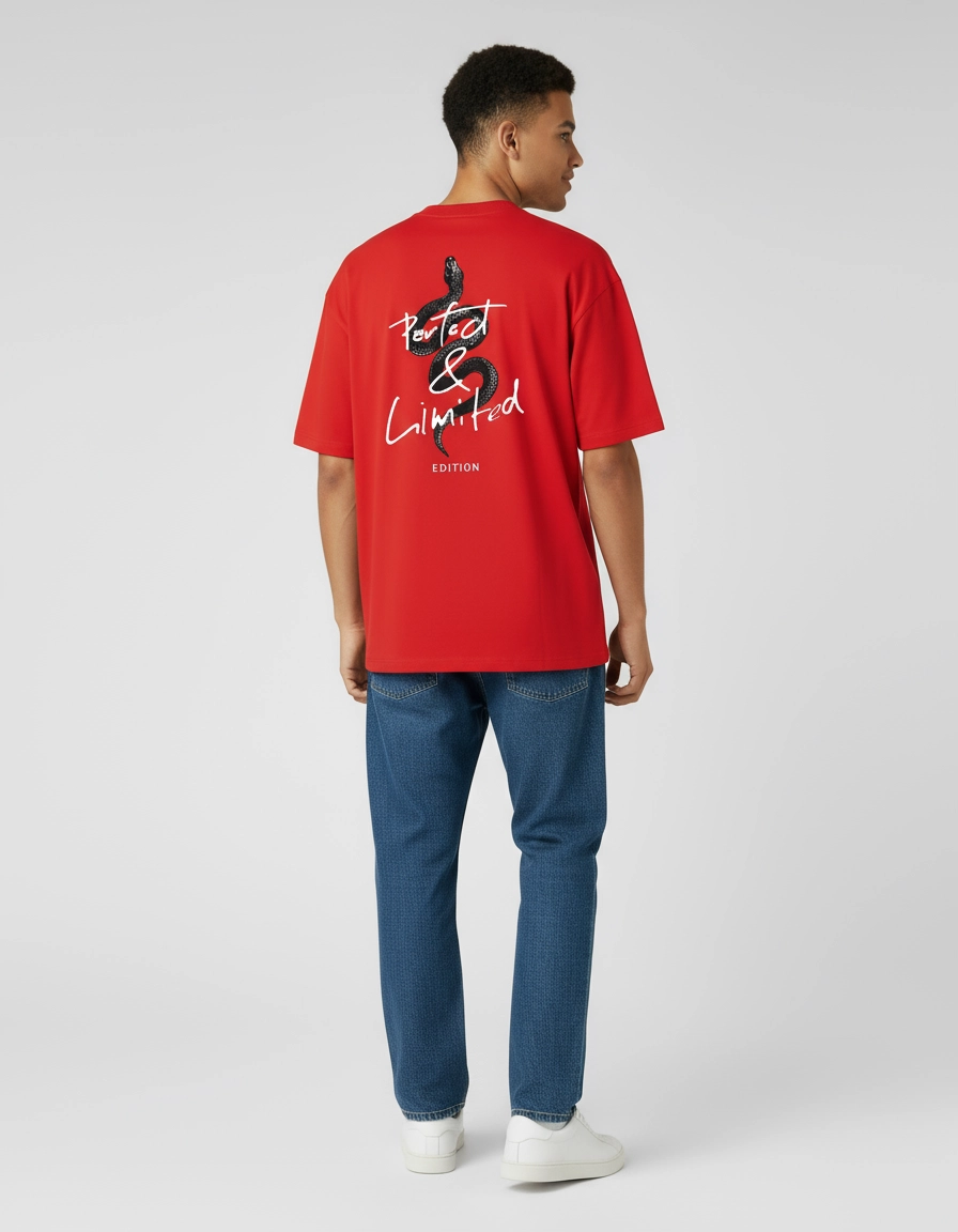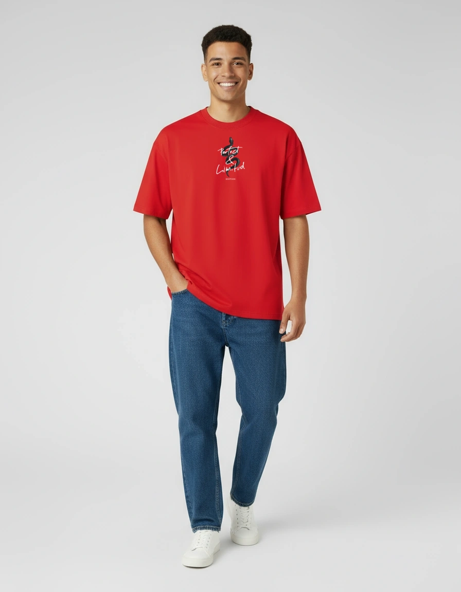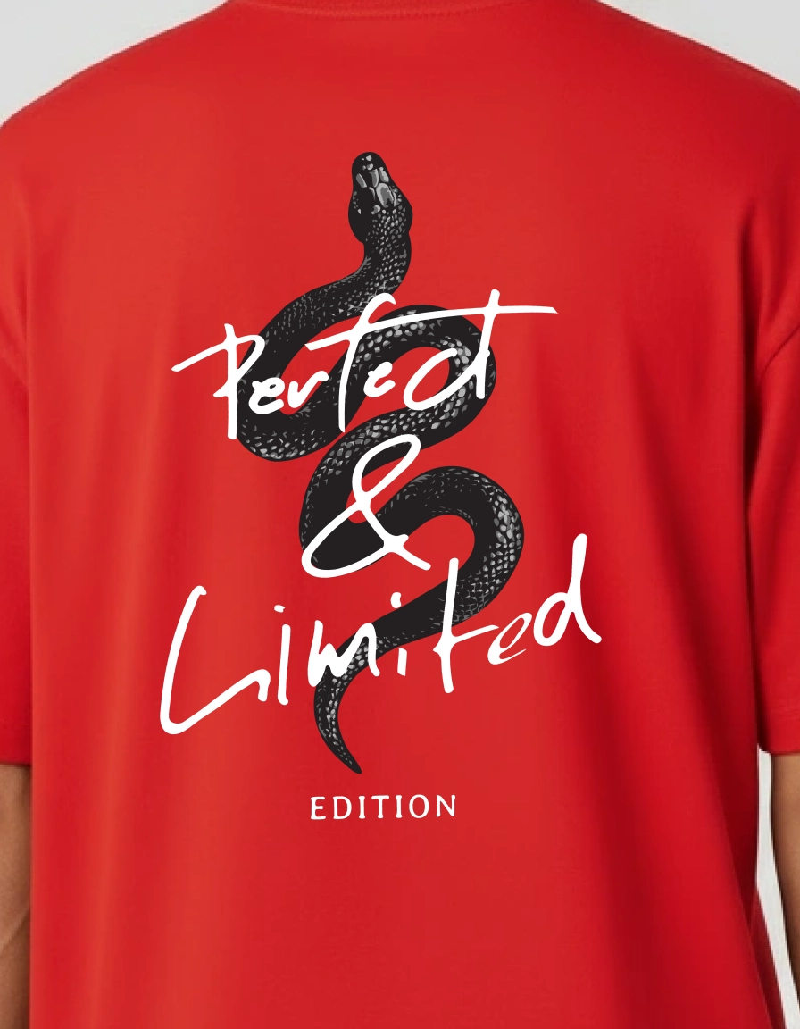 Express exclusivity with the Perfect and Limited Red Oversized T-Shirt. Elegant black calligraphy "Perfect Limited" with artistic brush strokes and "FUTURISM" text. Premium cotton on vibrant red base creates sophisticated aesthetic. For individuals who value rarity, quality, and limited edition style.